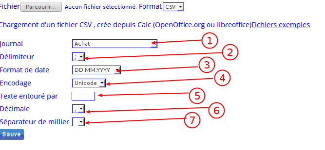 Il faut donner le journal où les opérations seront importées (1) , la façon dont les colonnes sont séparées (2) , le format de date (3), l'encodage unicode (4) …