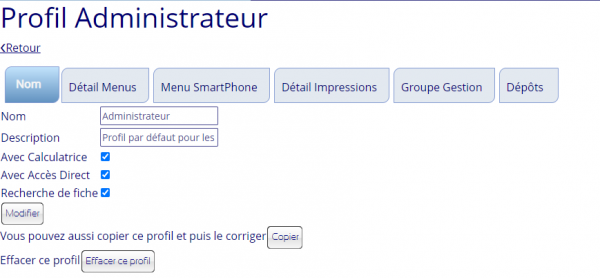 Configuration des profils des utilisateurs, permet de fixer les journaux, profils dans les documents et stock que ce profil peut utiliser. Cela limite les utilisateurs puisque ceux-ci ont un menu , et il n'est pas possible qu'ils accèdent à un élément hors de son menu.