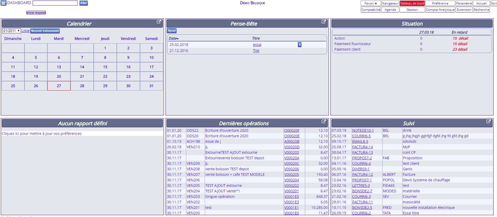 Tableau de suivi, vous permet de voir en un coup d'oeil vos dernières opérations, un petit calendrier, une liste de chose à faire…