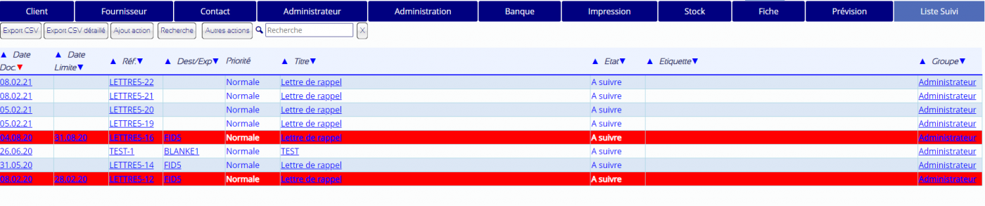 Menu : Gestion/follow La liste de suivi permet la gestion des différentes actions des clients ou fournisseurs