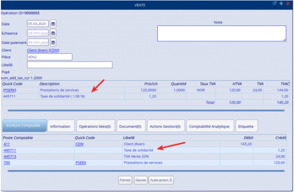 Afin de retrouver cette taxe, vous pouvez utiliser les balances (Accès Direct : PRINTBAL) , dans les détails d’écriture et dans les impressions par journaux (CSV , PDF compris) (Accès Direct : PRINTJRN) quand on ne choisi que le journal avec une taxe supplémentaire.