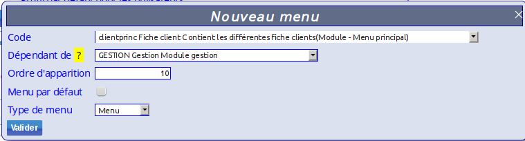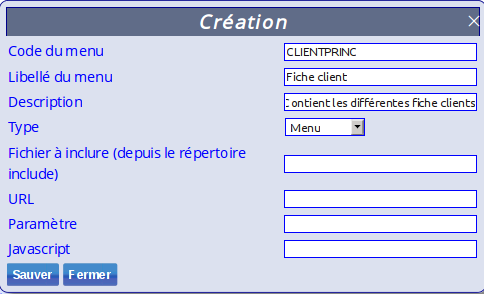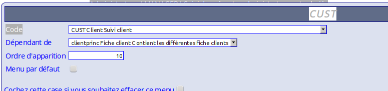 Afficher le texte sourceAnciennes révisionsLiens de retourHaut de page Share via Share via... Twitter LinkedIn Facebook Pinterest Telegram WhatsApp Yammer Reddit TeamsDerniers changementsSend via e-MailImprimerPermalien × Tout d'abord, vous devez créer dans CFGMENU le menu qui va contenir les sous-menus. Le menu principal ne contient aucun fichier ou url Ensuite dans CFGPRO vous devez ajouter ce menu, puis lui ajouter les sous-menus Les éléments de menus ont un numéro d'ordre les classant de gauche à droite. tutoriaux/ajout_d_un_menu_principal_avec_sous-menu.txt Dernière modification : 2019/05/20 09:20de melopie