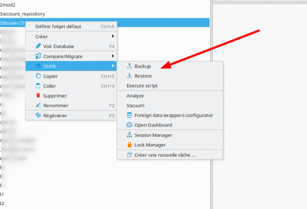 3. Clic droit sur la base de données dans laquelle on veut restaurer et faite restaurer , le format est “Personnalisé ou Tar” le nom de fichier est votre fichier et le rôle est l'utilisateur utilisé pour vous connecter