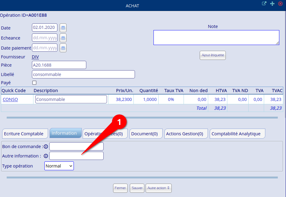 - communication depuis le détail opération dans l’onglet “Information”, le texte dans “Autre information”